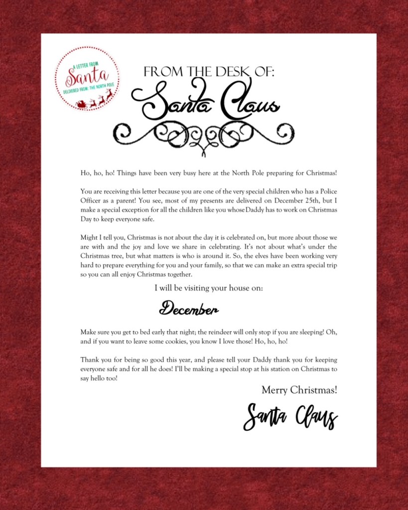 A printable letter from Santa for children whose Police parent is working on Christmas, resulting in the need for an extra special trip from Santa. Daddy and Mommy versions available below!